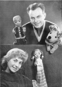 Heinz Fülfe und seine Frau Ingeburg erfanden und führten vom 23. Januar 1955 an die bald überaus populären Handpuppen 'Flax und Krümel' mit dem Hund 'Struppi' im Adlershofer Kinderfernsehen. |