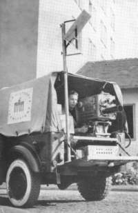 Mobile Übertragungstechnik, vom DFF mit einer englischen Pye-Kamera improvisiert. So war es möglich, ab 1959 auch die großen Radrennen der 'Friedensfahrt' live zu übertragen. |