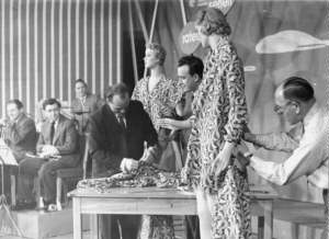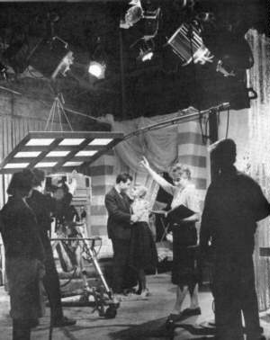 | Am 21. Februar 1959 wurde das Fernsehspiel 'Wenn die Nacht kein Ende nimmt' des Wiener Autors Karl Georg Külb aus dem Adlershofer Studio IV live gesendet. Die Aufnahmeleiterin gibt den Darstellern Christel Bodenstein und Armin Mueller-Stahl das Zeichen zum Beginn ihrer Szene vor den modernen Orthikon-Kameras. | ![]() |