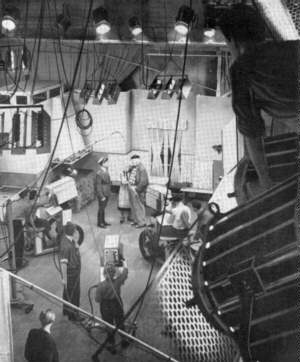 | Ein Foto aus dem Adlershofer Studio III. Noch mit den Ikonoskop-Kameras aus eigener Laborproduktion wird eine Szene aus dem Fernsehspiel 'Der Zug nach Marseille' geprobt, einer Adaption des Schauspiels von Krzystof Gruszczynski. Die Live-Sendung erfolgte am 20.11.1955. | ![]() |